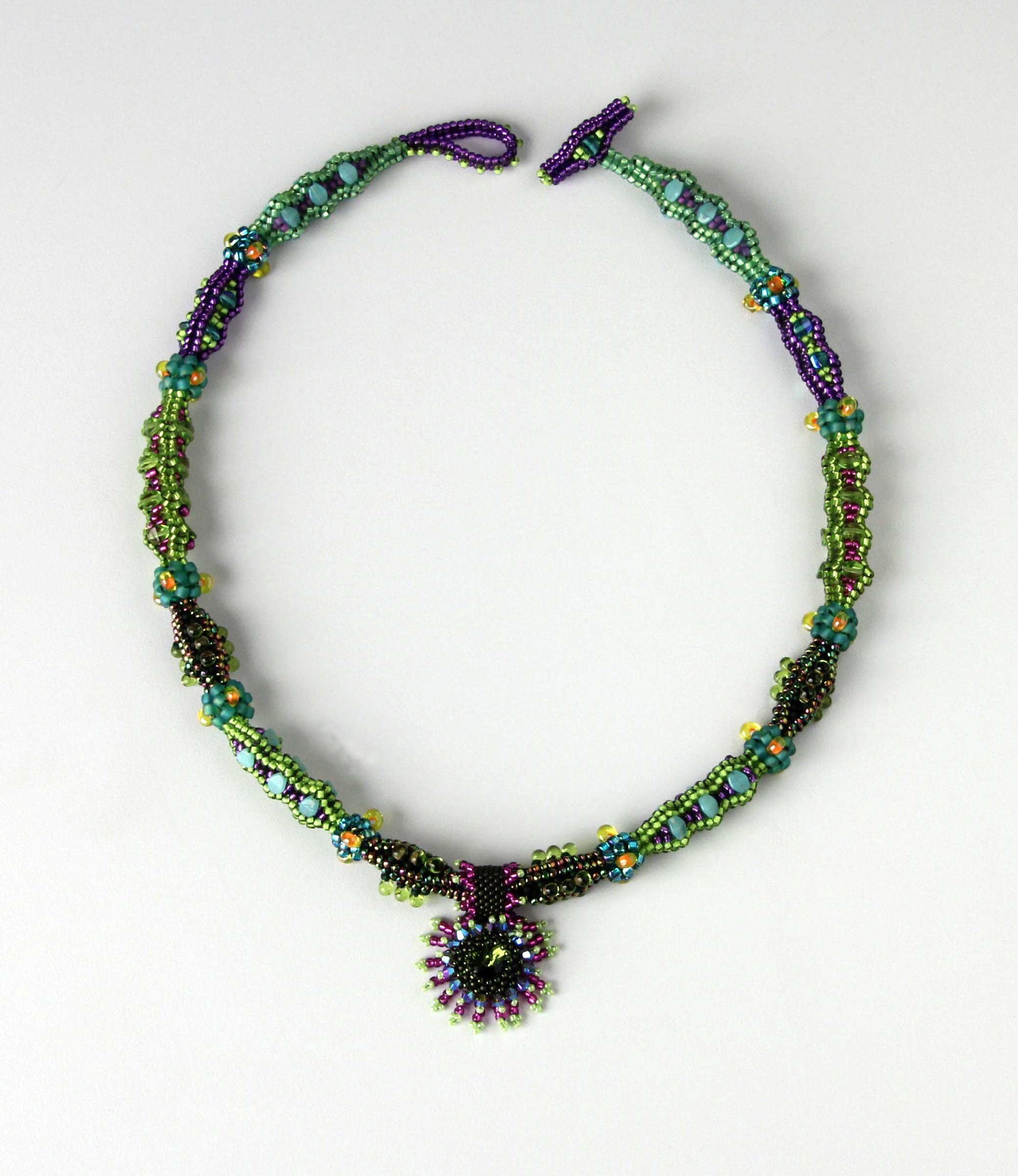 Evocative of lazy, sun-filled days lying on a California beach, listening to Mama Cass, this lovely necklace is really fun to make. Starting from a ladder stitch base, the rest of the necklace is worked in herringbone stitch. Multiple increases create the central spiraling element which has a lovely freshwater pearl tucked into its center. The necklace strap is worked in tubular herringbone stitch. By changing the color sequences of the beads, students can easily customize their own work of art. Intermediate - Advanced Skill Levels